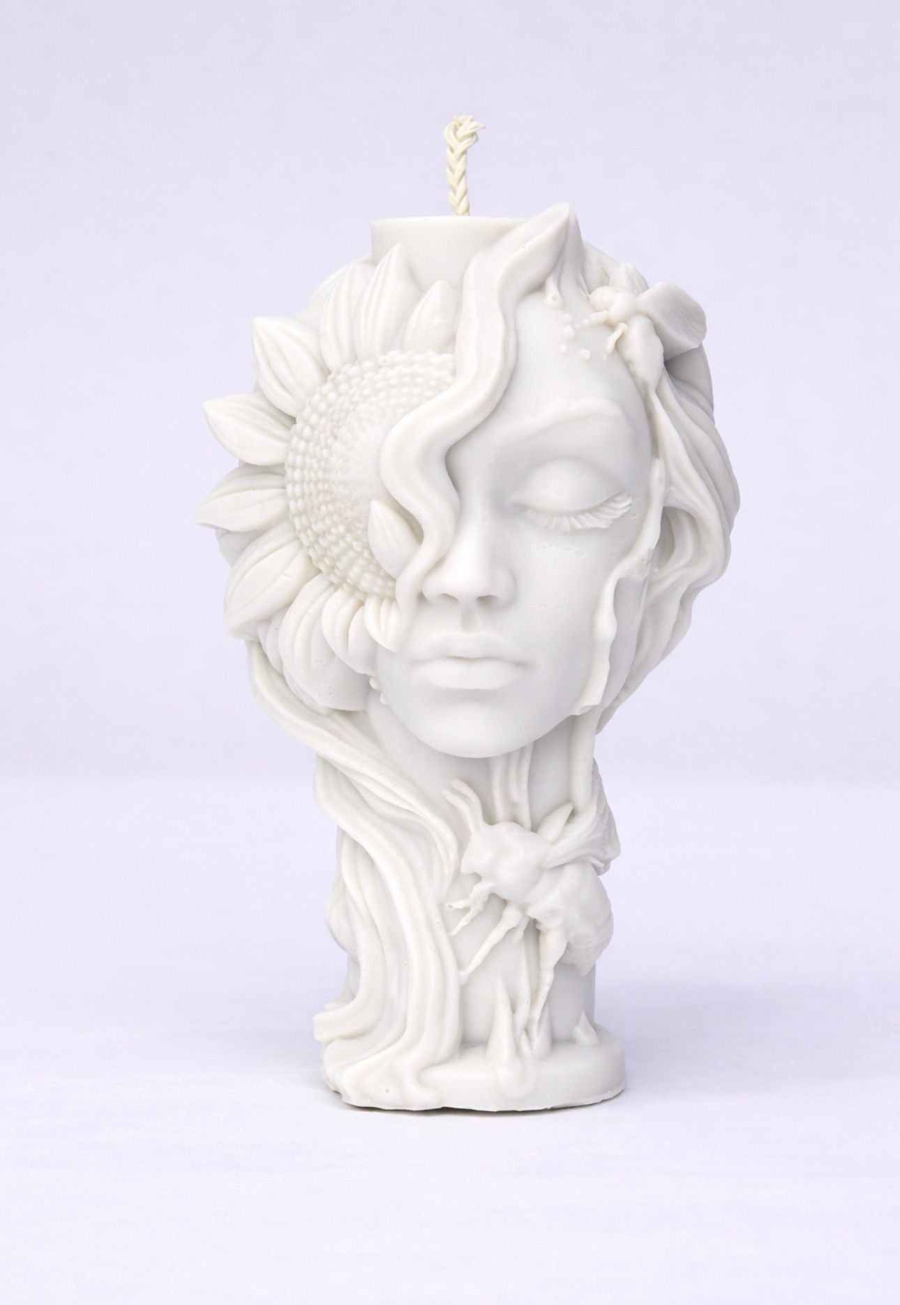 Deze handgemaakte kaars combineert kunst en sfeer in één uniek ontwerp. Met de gedetailleerde zonnebloem, het elegante gezicht en het subtiele bijtje is dit een echte blikvanger in elk interieur.
