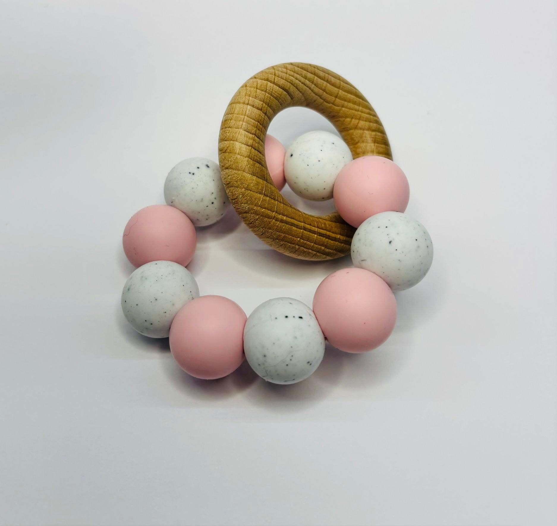 Deze bijtring is gemaakt van BPA-vrije silicone kralen in zachtroze en marmerwit, gecombineerd met een gladde houten ring die zorgt voor extra grip en speelplezier.