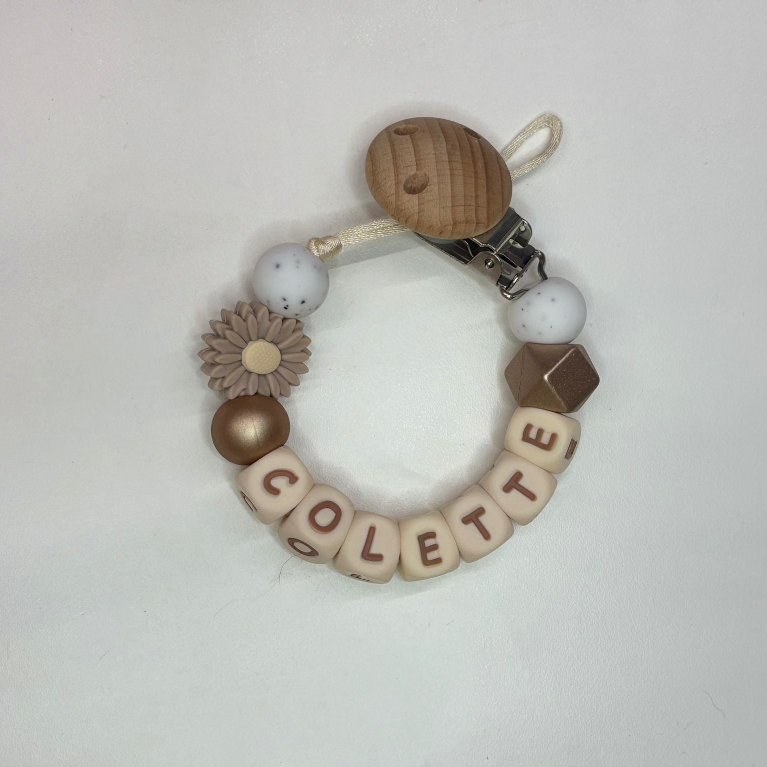 Geef je kleintje een stijlvol en praktisch accessoire met onze prachtige speenkoord met naam! Deze handgemaakte speenkoord is niet alleen een veilige manier om de fopspeen van je baby bij de hand te houden, maar voegt ook een persoonlijke touch toe aan zijn of haar look.